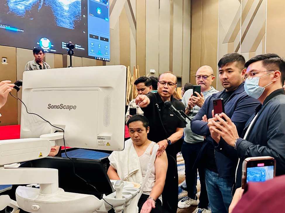This post-conference skills laboratory workshop was made possible through a collaboration with Sonoscape Ultrasound APEC and SA-US division. The company provided technical support and showcased their P80 machine among five others, which had Artificial Intelligence functions. This top-of-the-line unit has the capacity to connect the MSKUS monitor wirelessly to the LED screen or projector, which makes it ideal for teaching and instructional purposes for small to large audiences. It also features camera capacity to project the hand position of the scanner real-time, a feature which is best for teaching one-on-one, with a mentor even from remote on-line settings.